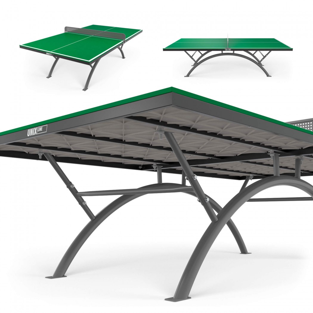 Столешница уличного стола UNIX Line изготовлена из SMС - панели с антибликовым покрытием и выдерживает многочисленные нагрузки, обладает хорошей устойчивостью к ударам, воздействию окружающей среды, влаге и температурным перепадам. Она не является горючим материалом, а также за счет высокой плотности и толщины столешницы (14 мм) обеспечивает великолепный отскок мяча и высокие игровые характеристики.
