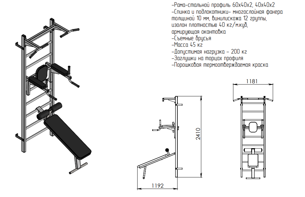Шведская стенка с турником, брусьями и скамьёй для пресса |